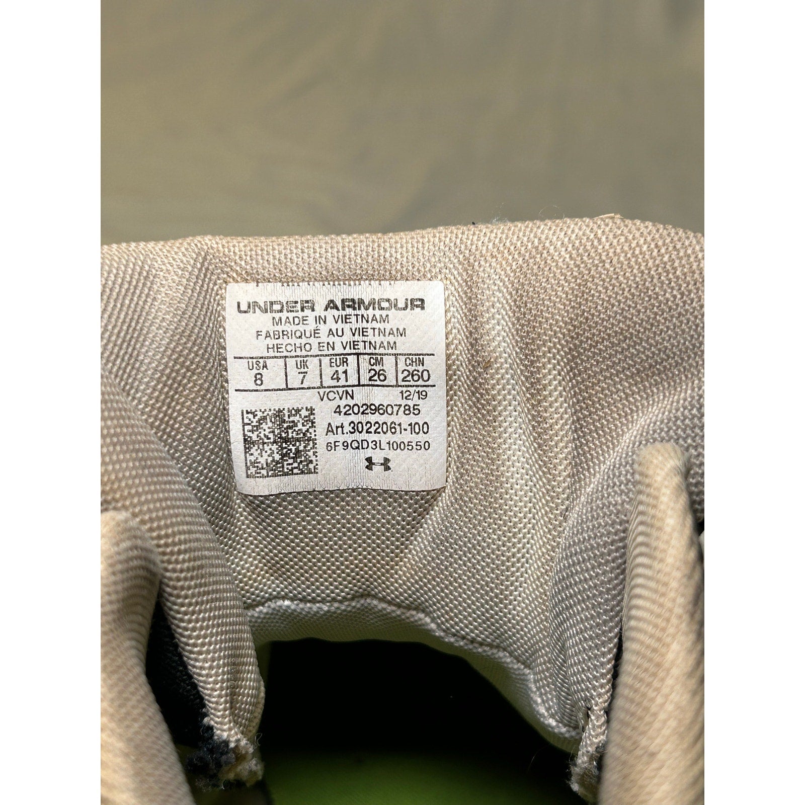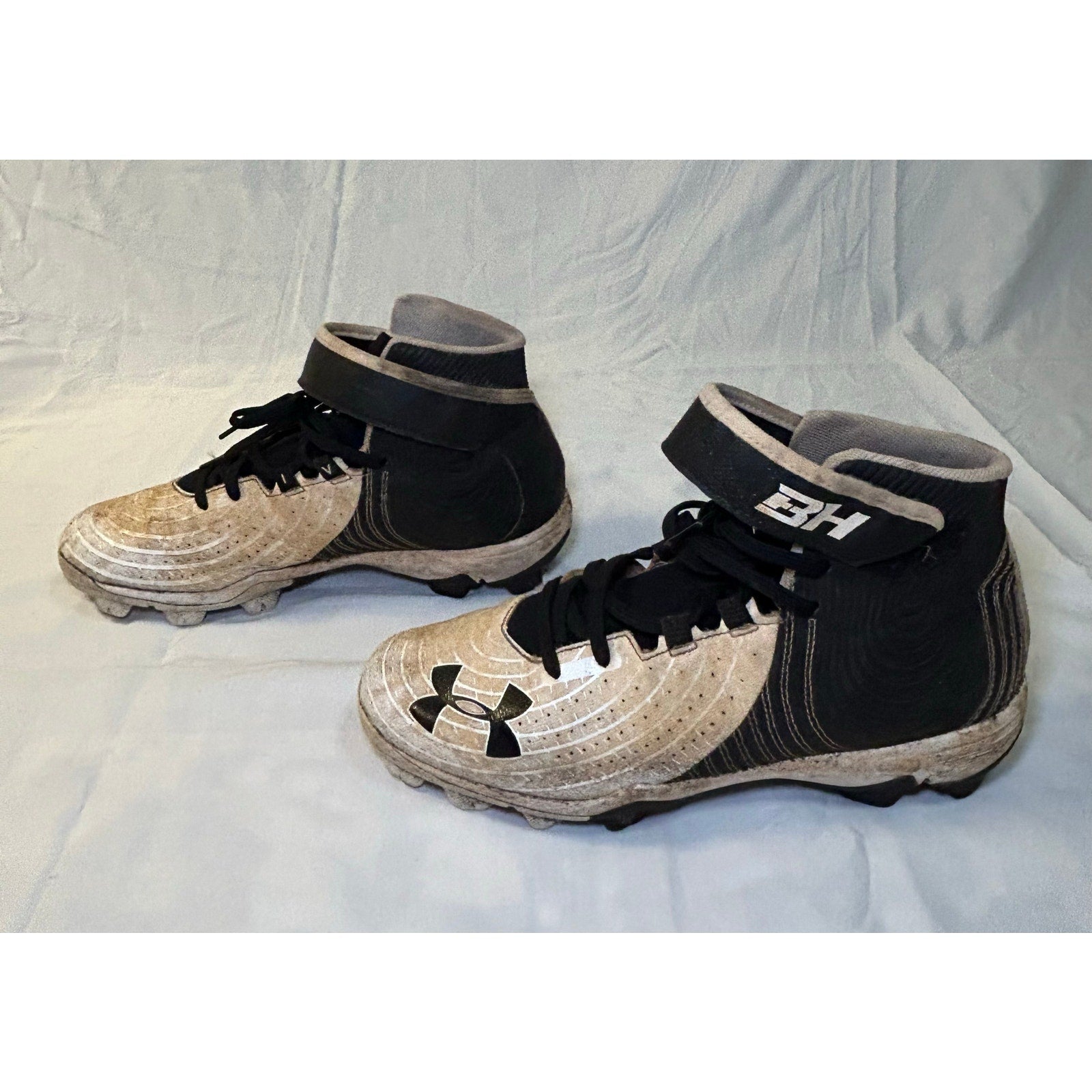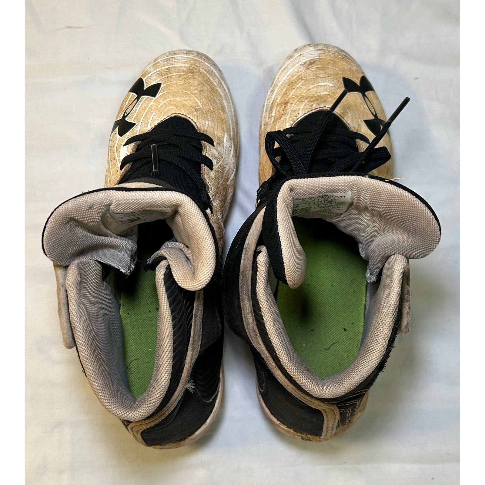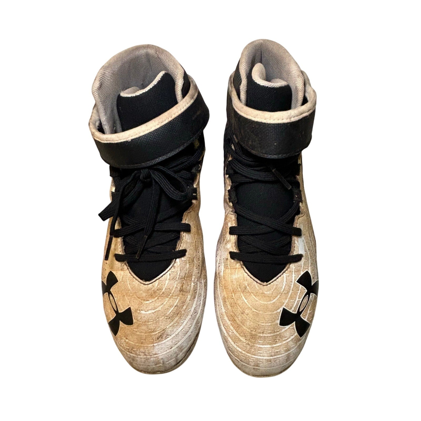 Get ready to dominate the field in these rugged Under Armour Football Cleats (size 8)! With their bold black and white design accented by a natural “battle-tested” look, these cleats are proof of their grit and determination. The high-top style offers maximum ankle support, while the secure lace-up system and Velcro strap ensure a snug fit for every sprint, tackle, and touchdown.